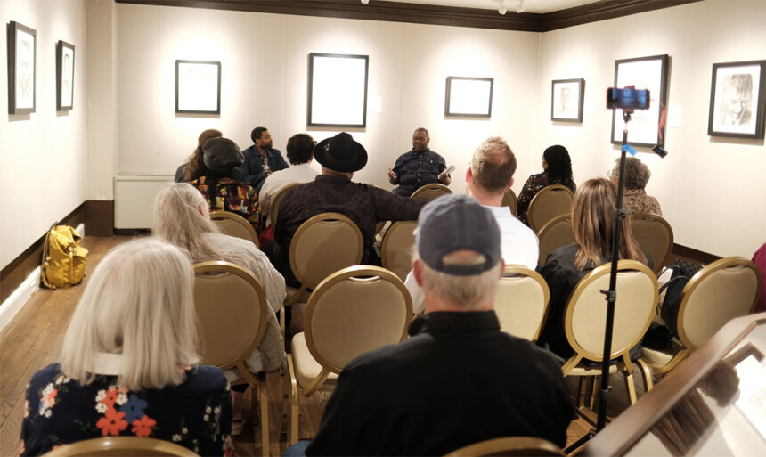 Richard Lewis speaks at the Saginaw Art Museum & Gardens about his exhibition, “The Price of the Ticket,” which remains on display through April 25. (Courtesy of the Saginaw Art Museum & Gardens)