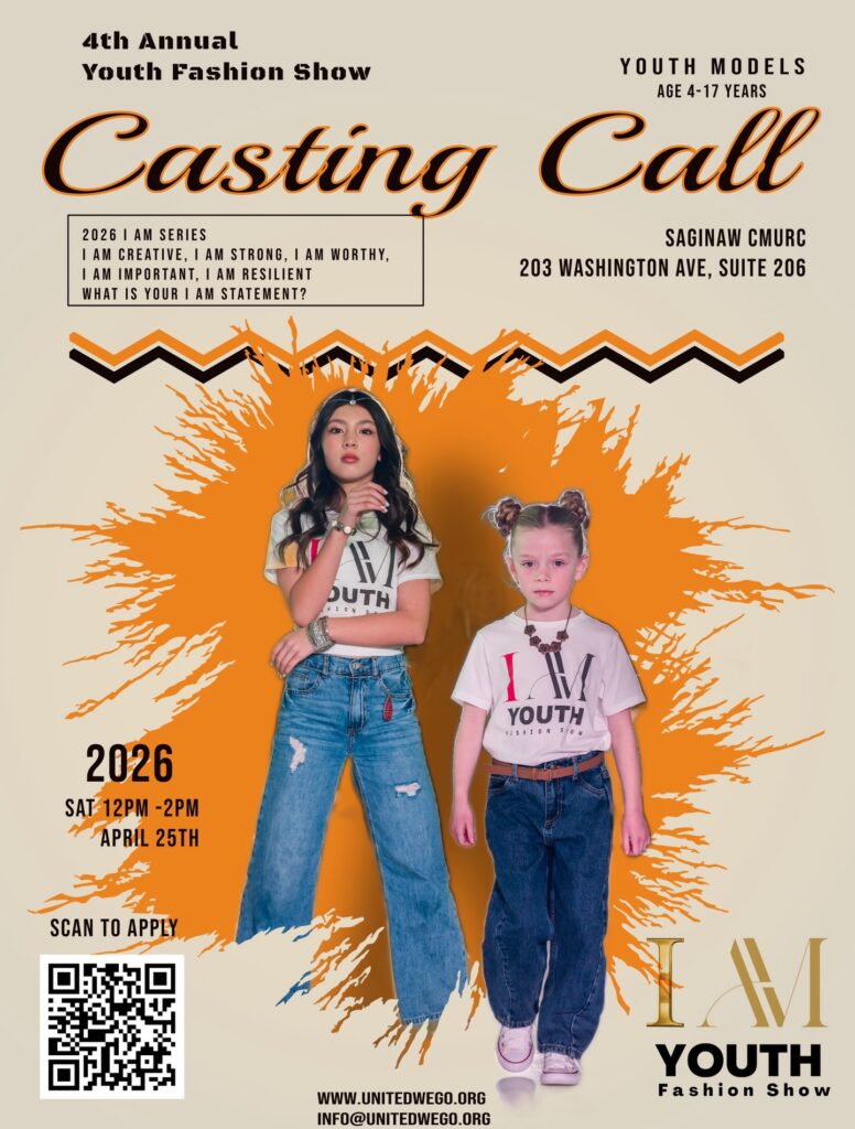 SAGINAW, Mich. — United We Go is accepting applications for youth ages 4 to 17 for its fourth annual I AM Youth Fashion Show, a Great Lakes Bay Region program that blends fashion, creative expression and confidence-building for children and teens. The casting call is scheduled for noon to 2 p.m. April 25 at CMURC Saginaw, 203 Washington Ave., Suite 206. The application deadline is April 24, and the fashion show is set for July 12.
